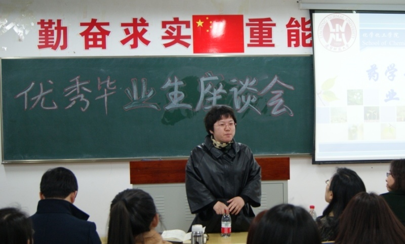 药物化学专业在理化楼C区411教室召开本科生优秀校友座谈会。本次座谈会请来现就职于中国医科大学的药化专业2010届毕业生徐恩宇,现就职于大连疾病控制中心的药化专业2008届毕业生王晓静,以及现就职于大连医诺生物有限公司的药化专业2009届毕业生王琳。教学院长杨梅、学院副书记李群、2014级辅导员于祥昀、药物化学系的王澈、李健生、郝强等教师出席会议,药物化学专业全体学生参加会议,座谈会由药物化学系主任徐缓主持。
