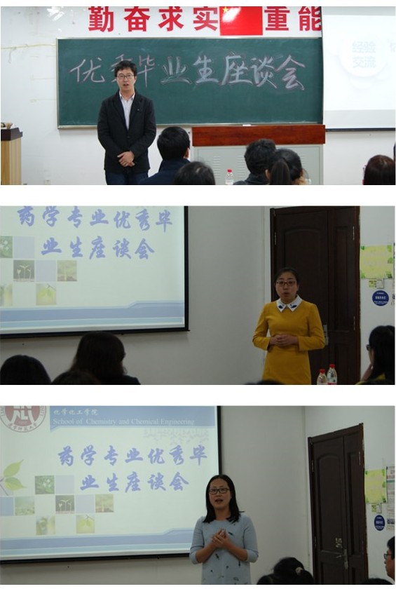 三位优秀校友与同学们分享了自己的成长经历和成功经验。徐恩宇进行了题为“忆往昔岁月,还看今朝”的演讲,他指出作为一名优秀本科生必须具备的个人素养:秉承校训—厚德博学,为人师表,具备一定的英语技能,精通专业课,能够独立思考,学会为人处事。王晓静和王琳分别为大家介绍了事业和企业单位的基本招聘准则及工作环境,并结合药物化学专业特点详细分析择业、就业要点。三位校友的演讲幽默风趣,妙语连珠,使同学们受益匪浅,对择业、就业有了很大的启发,引起了同学们的共鸣,不时博得阵阵掌声。