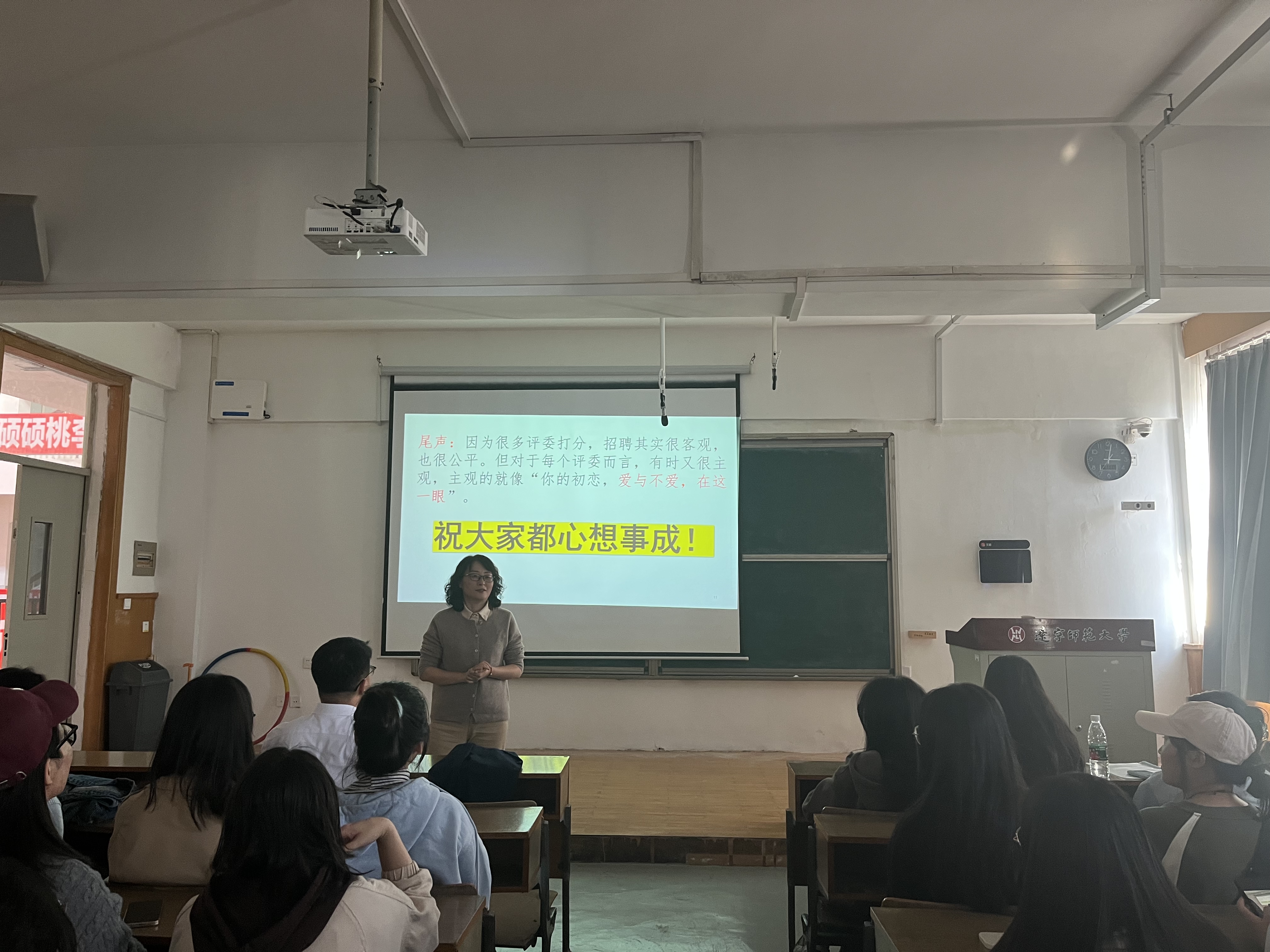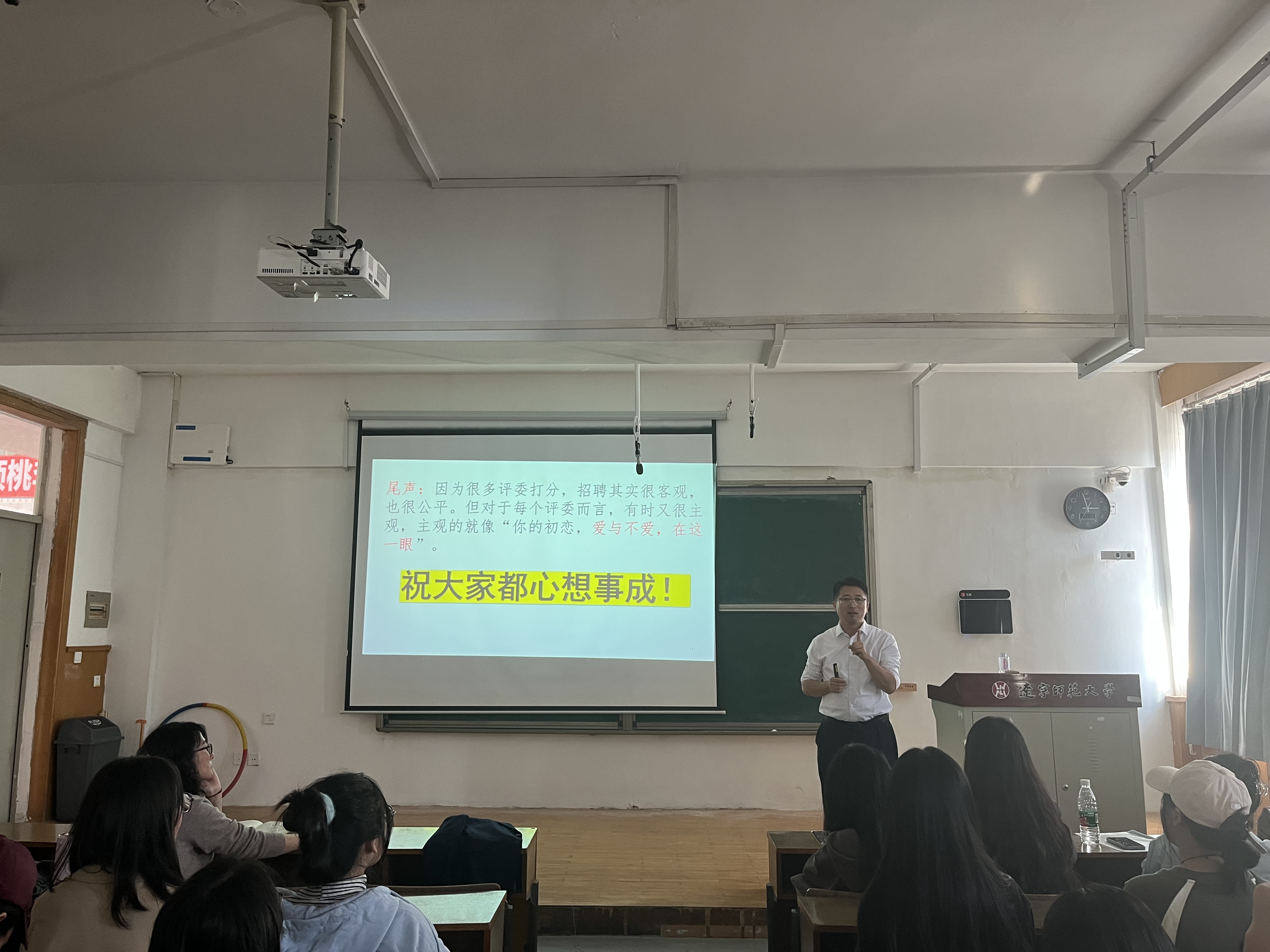 讲座开始,赵扬老师通过“认真分析招聘公告”、“提前准备面试材料”和“什么样的简历更好”3个部分,指导同学们做好面试前的充分准备。接着,赵扬老师为大家深度剖析了面试环节应聘岗位必需能力的考察要点,以及集中面谈环节、试讲环节、试讲后问答环节的注意事项。最后,赵扬老师简要介绍了面试通过后的后续手续。