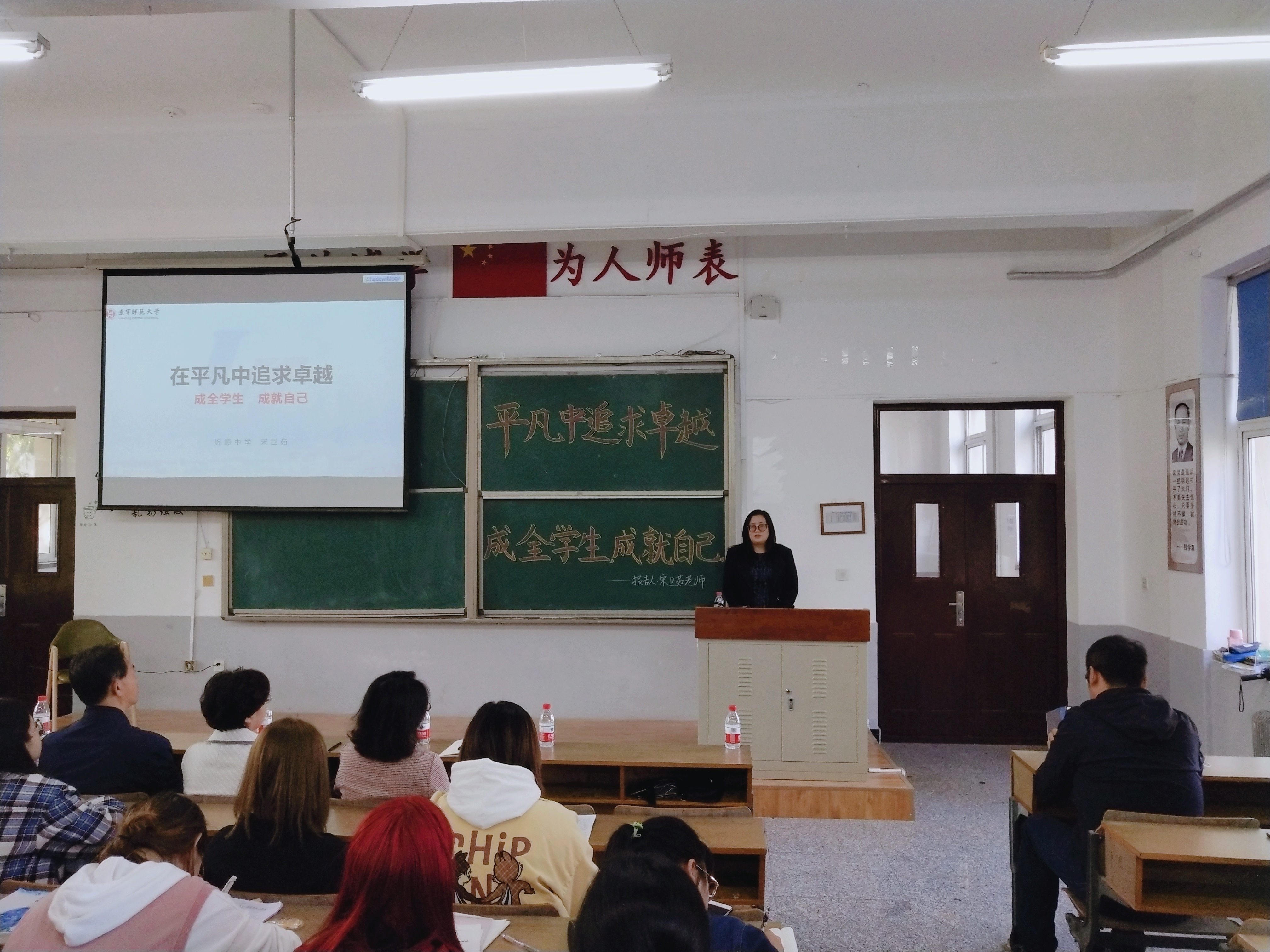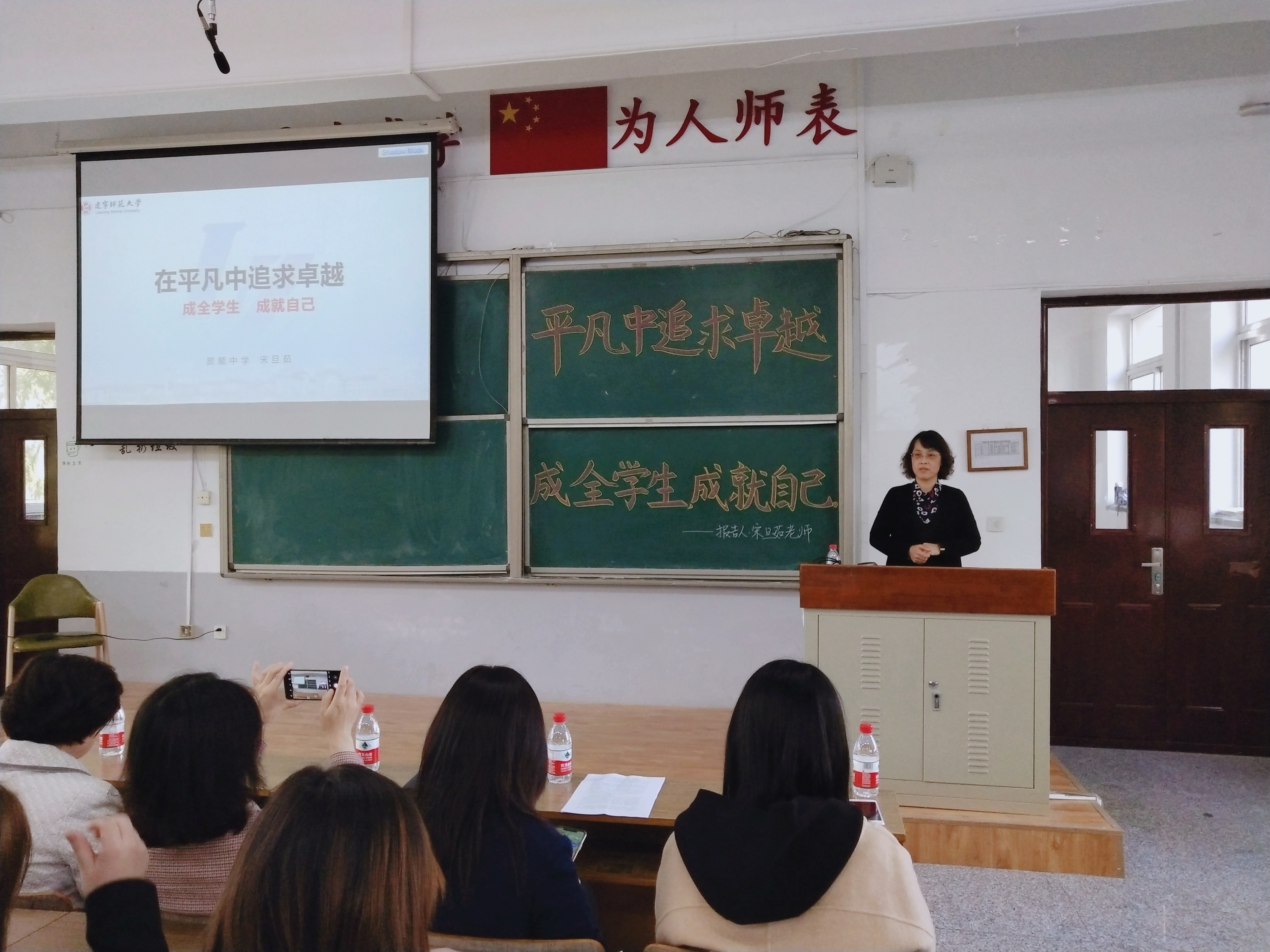 随后,宋旦茹老师正式开始报告。宋老师对学院的邀请表示真诚的感谢,回顾自身的从教经历并讲到:只要将自身工作做实做好,就一定能得到认同。宋老师将本次报告分为:“爱岗敬业”、“关爱学生”和“班级管理”三个方面与大家分享。