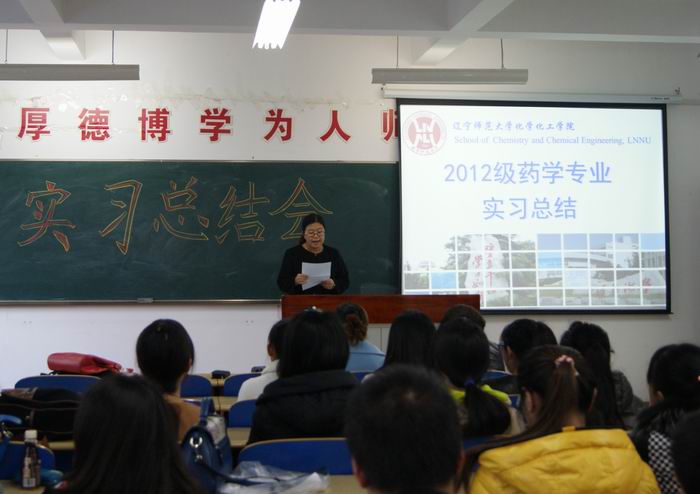 2015年11月10日下午两点,在理化楼A区213教室召开2012级药学专业实习总结会议。大连市药检所所长助理李军老师、实习指导教师徐缓、李坤出席会议,2012级药学专业31名同学参加会议。