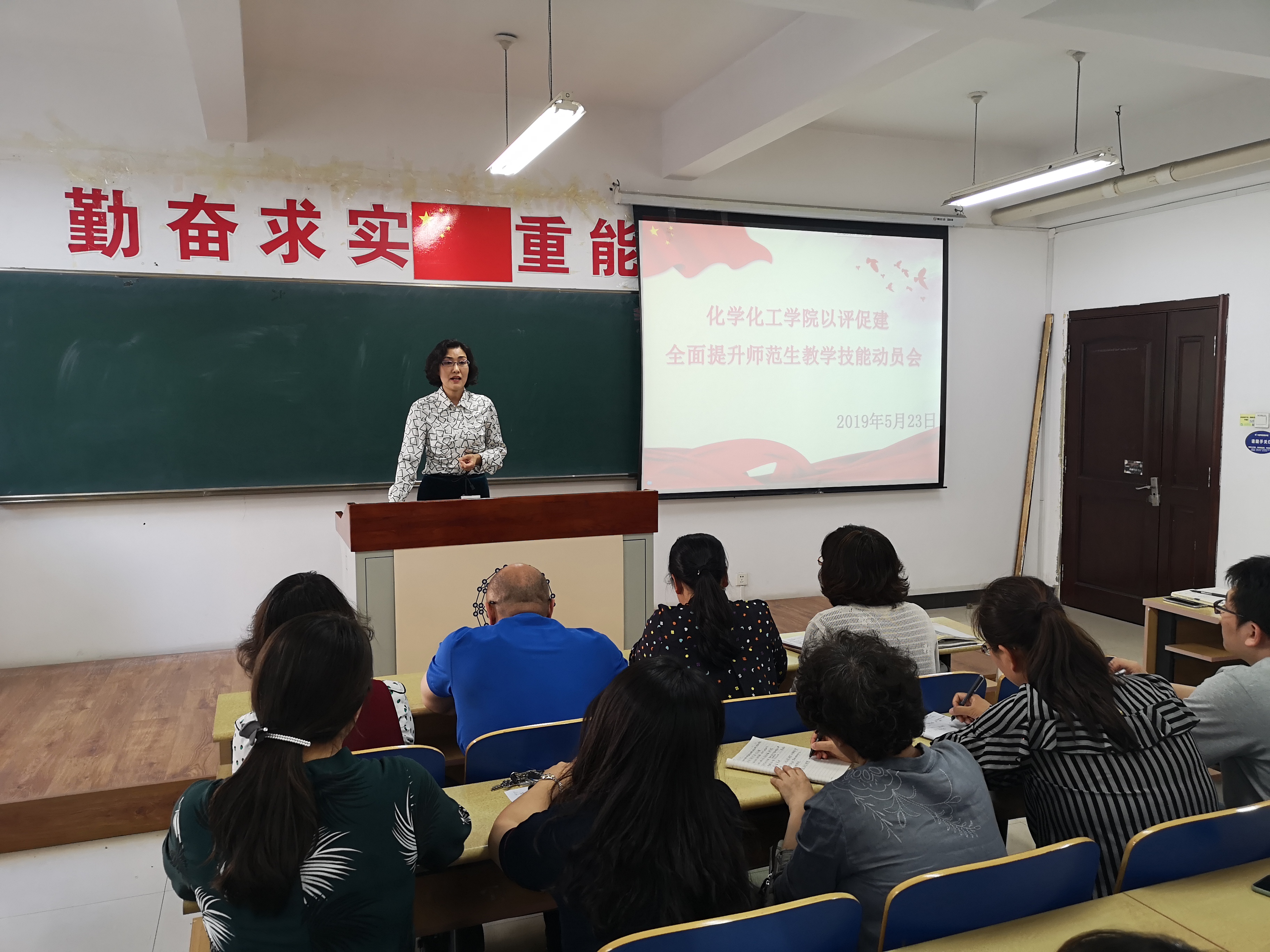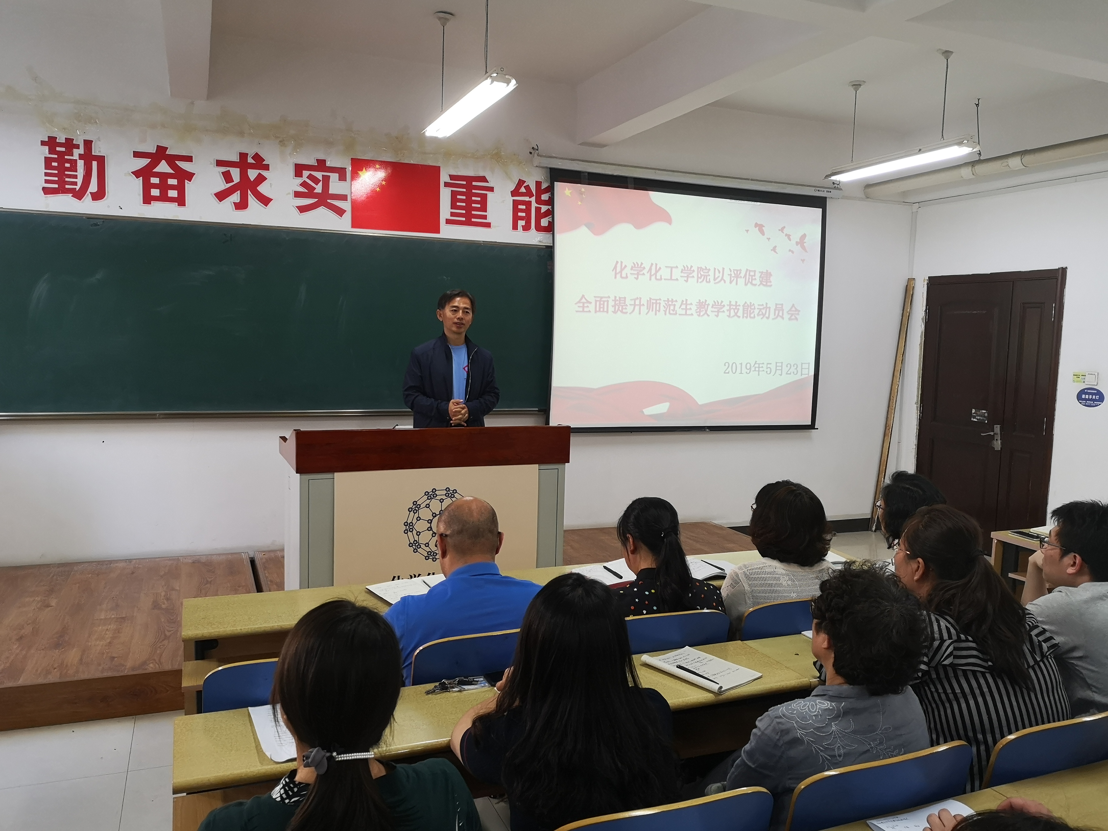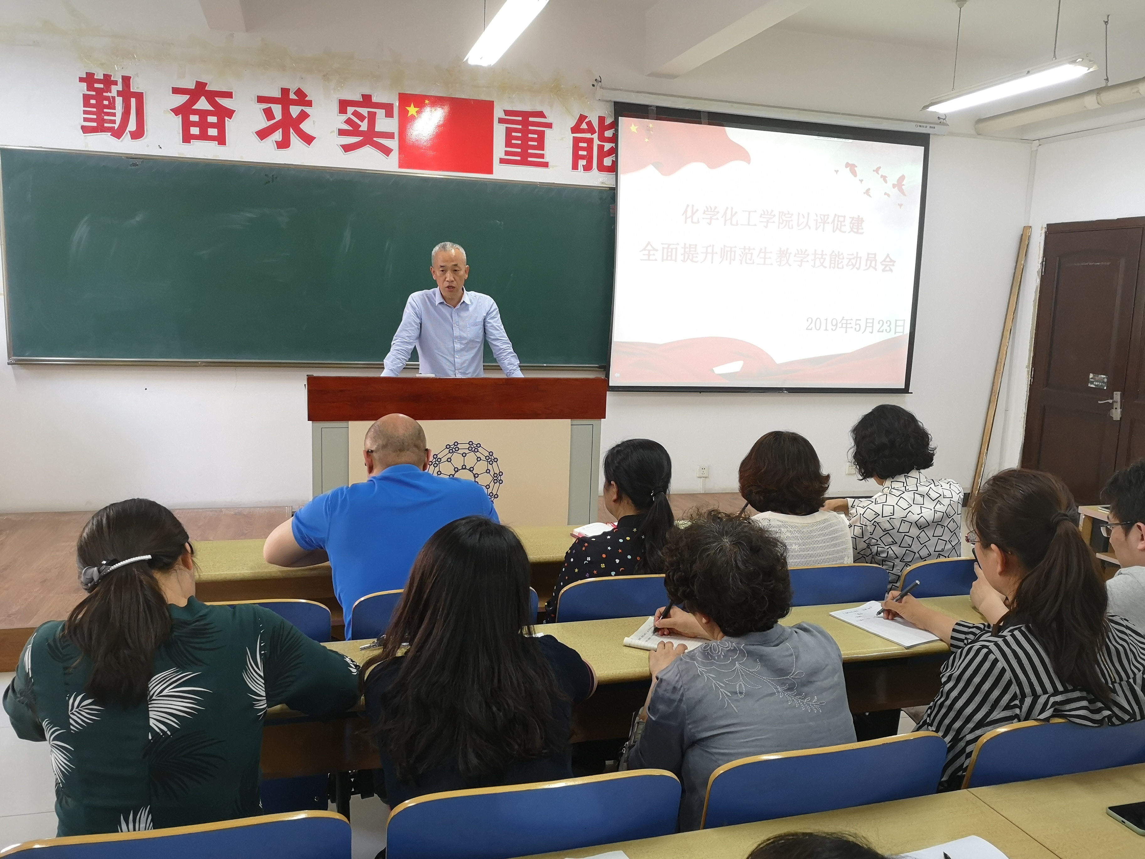 523日下午,世界杯 在理化楼411召开“以评促建,全面提升师范生教学技能”主题活动动员大会。学院党委书记刘智广、院长王长生、党委副书记李金英、副院长金晶,学院化学教育研究所所长王秋、学院教学技能训练组白凤英、迟玉贤、单文娟、刘翠、朱江、张琳、李书实,团委书记苑朋栋、原2015级辅导员肖虹以及2015级化学师范专业全体同学参加了会议。会议由党委副书记李金英老师主持。