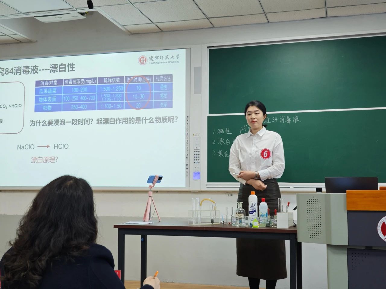高雪同学以“走近84消毒液”为主题。选题贴近生活,符合学生所经历的生活实际,能够激发学生学习的兴趣,引导学生关注生活中的化学品,用化学的视角关注与化学有关的社会问题。课后设置了“制作84消毒液使用手册并派发”的课后作业,鼓励用所学知识参与社区服务。课前课后相互呼应,让学生感受到化学对生活的重要性,充分体现了化学使生活更美好。赛后评委老师对其课程设计、教资教态、课堂掌控等方面给予了高度评价,最终以96.40分的高分一举夺魁。