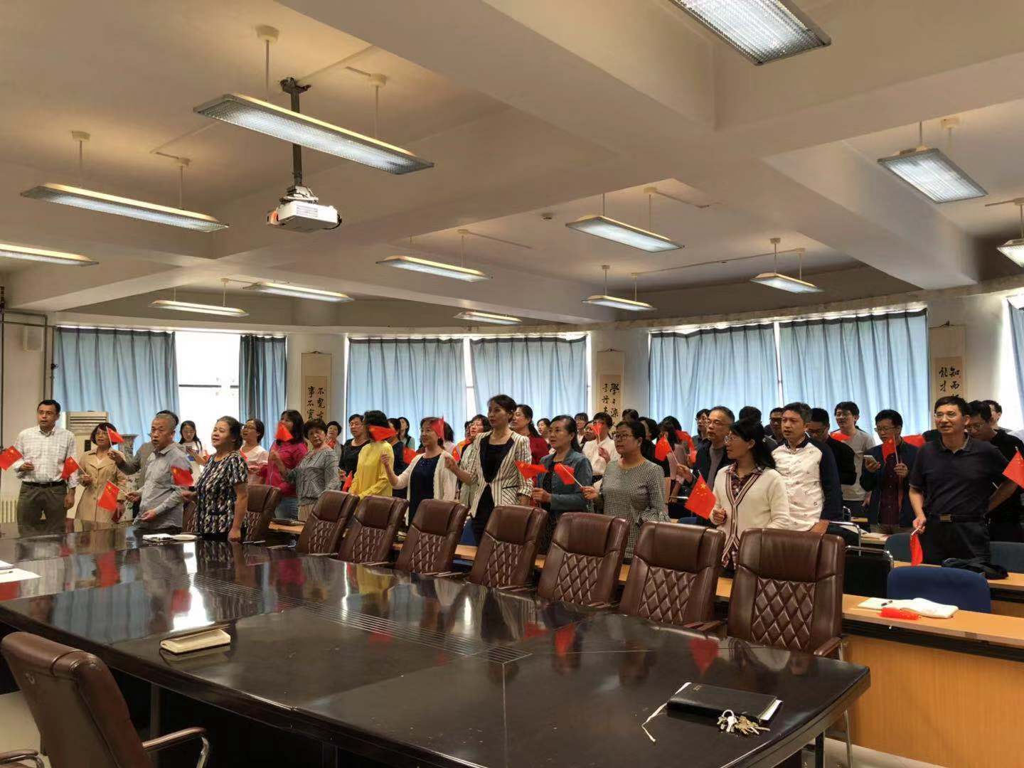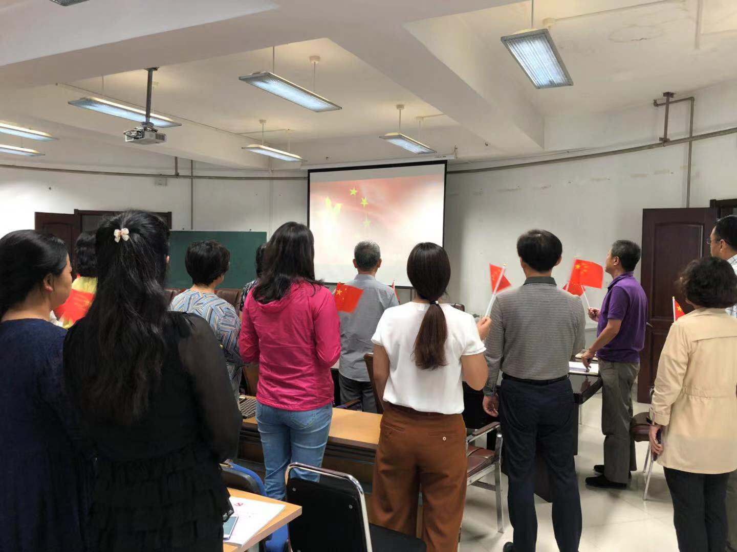 为落实“不忘初心·牢记使命”主题教育工作,庆祝新中国国70周年华诞,9月20日下午14:00,在理化楼C区401会议室,世界杯 全院教师手持国旗齐唱《歌唱祖国》。