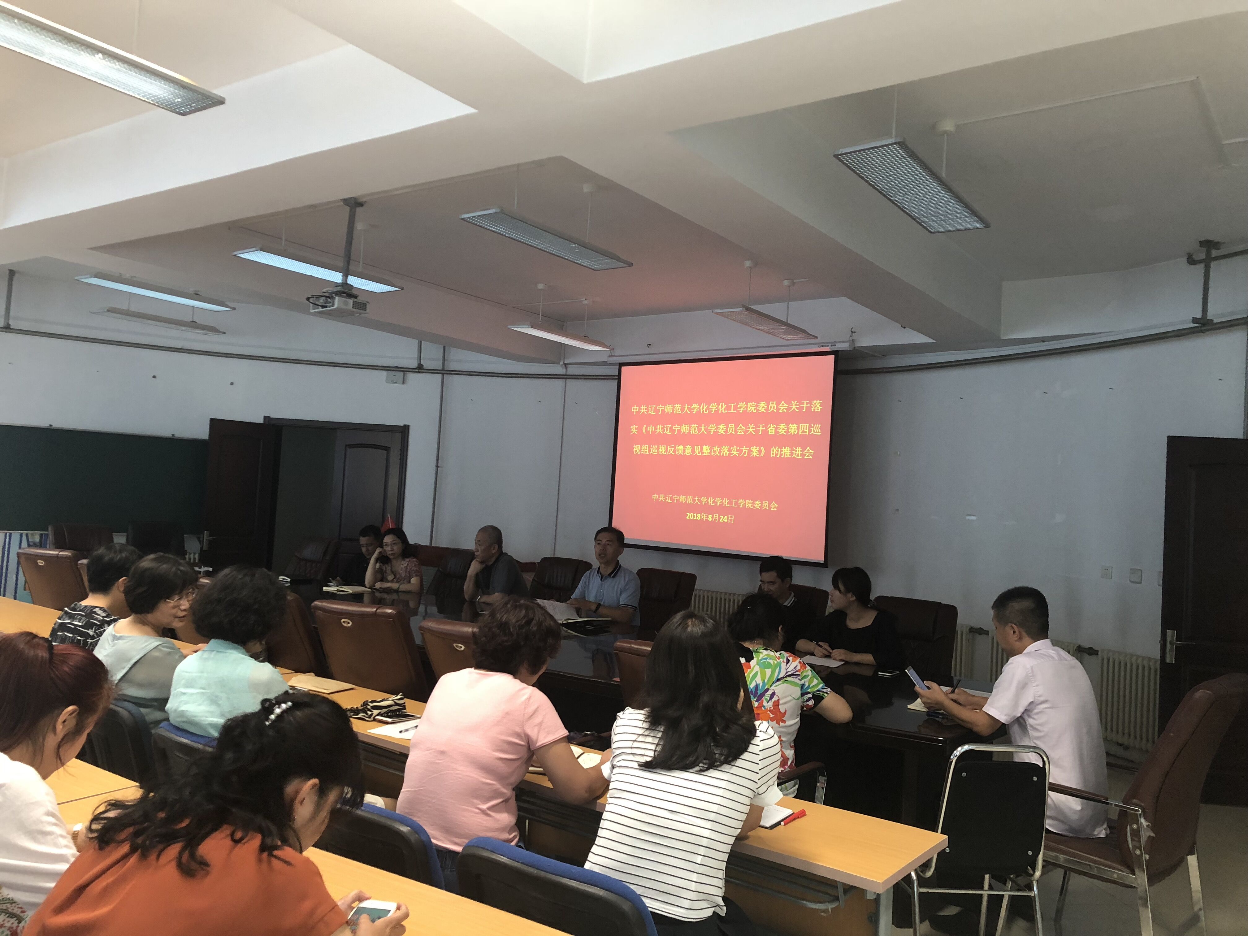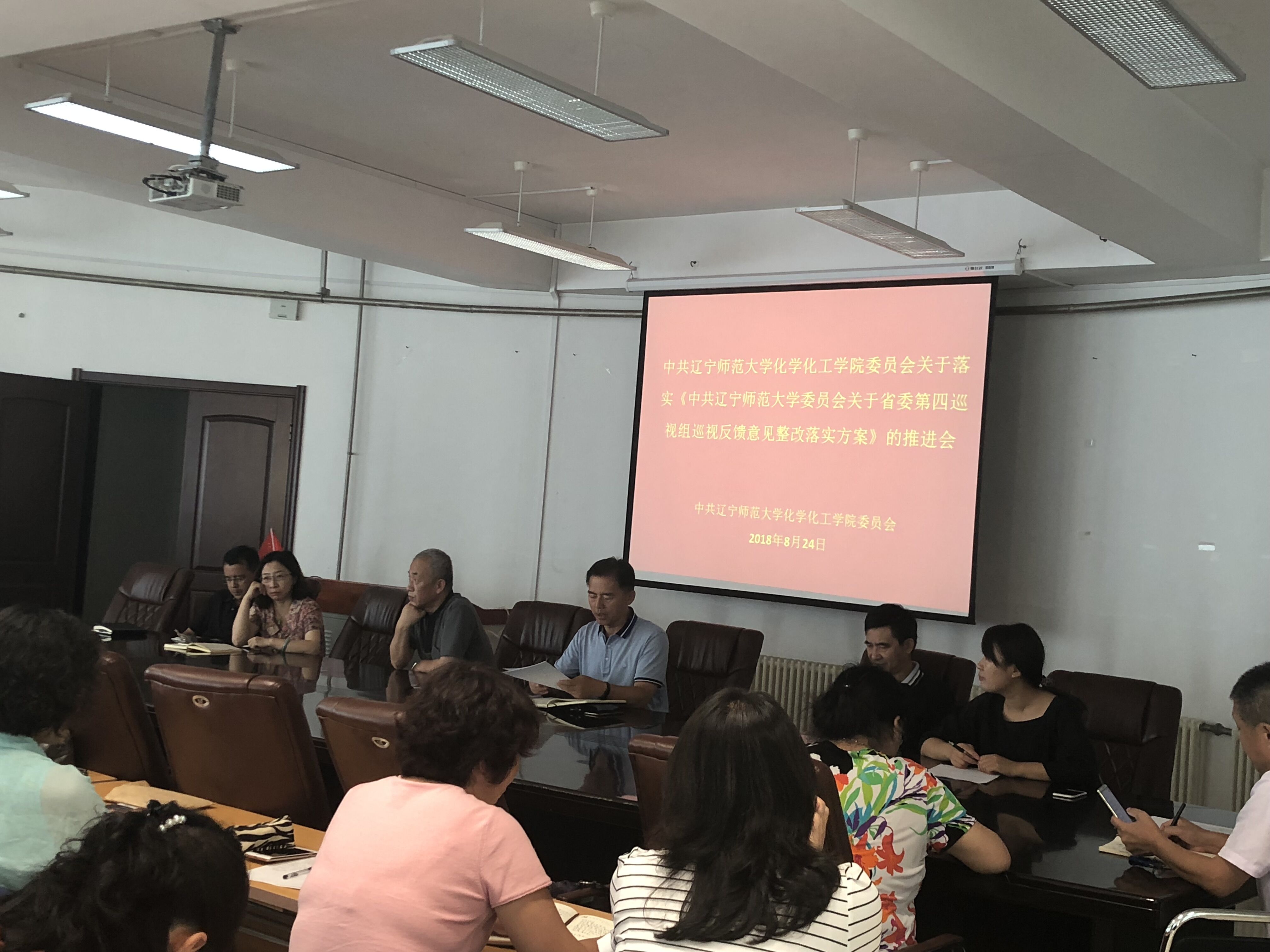 在理化楼C区401会议室召开关于落实《中共辽宁师范大学委员会关于省委第四巡视组巡视反馈意见整改落实方案》的推进会,部署整改落实工作,学院党总支书记刘智广主持会议,全体教师参加。