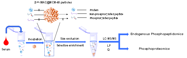 本研究成功制备出一种新型锆修饰介孔材料,用于高效富集血浆中的内源性磷酸肽,为疾病诊断与生物标志物的发现提供了新工具。内源性肽是由3至100个氨基酸组成的天然多肽,广泛存在于人体组织、细胞及体液中,主要由前体蛋白裂解或通过基因编码产生。它们常常伴随翻译后修饰,如磷酸化。越来越多的研究表明,血清中的内源性磷酸肽能够揭示重要的生理及病理信息,具有成为疾病生物标志物的潜力。然而,相较于传统磷酸化蛋白组学,生物体液中低丰度内源性磷酸肽的全面识别仍面临较大技术挑战。为实现高灵敏度检测,亟需高选择性、强富集能力的材料。研究人员此次开发的多孔材料,具备磷酸特异性亲和性,能够有效排除蛋白等大分子干扰,实现对内源性磷酸肽的直接富集。