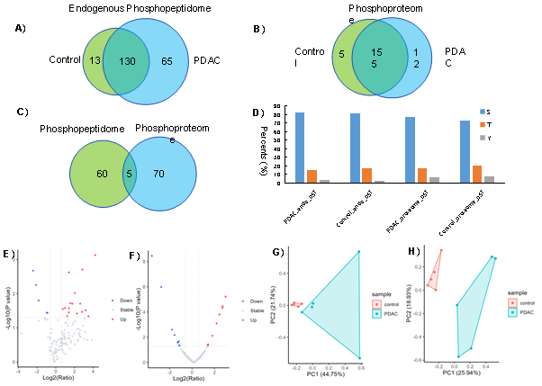 本研究以平均孔径约2.5 nm的MCM-48硅基介孔材料为基础,引入Zr⁴⁺离子作为功能组分。材料首先经酸处理生成大量羟基(-OH),随后依次通过APTES与戊二醛活化,接着引入含磷试剂AMPA,最终通过螯合作用将Zr⁴⁺固定在材料表面。该材料合成后,经多项理化性质表征,表现出优异的磷酸肽捕获能力与良好的重复性。研究人员进一步将其应用于实际血清样本中,从五例胰腺癌患者与五位健康志愿者的血清中直接富集内源性磷酸肽,成功鉴定出329条磷酸肽,构建了迄今为止规模最大的血清内源性磷酸肽数据集。此外,团队还对相应样本开展了磷酸蛋白组学分析,并与磷酸肽组数据进行比对,发现两者仅有5个蛋白重叠。这一结果提示:内源性磷酸肽组与磷酸蛋白组基本属于两个互补的生物信息来源。联合分析这两类数据,有望揭示更加全面的体内磷酸化图谱。该研究不仅提出了一种创新性材料构建与应用策略,更为内源性磷酸肽在疾病诊断、早期预警及靶向治疗中的研究与利用提供了重要平台。