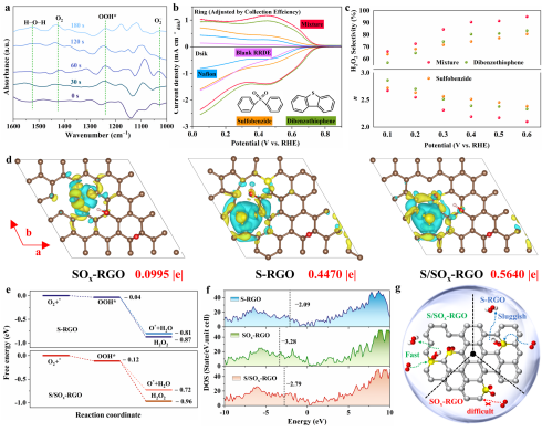 团队通过系统的实验表征与密度泛函理论(DFT)计算分析,深入探讨并揭示了两种硫活性位点在2e⁻ ORR中的独特作用机制。具体而言,C−S基团通过增强硫原子的电荷态来促进O2的吸附,从而有效推动了限速步骤O2→OOH*的进行;而C−SOx基团则通过电子效应及界面相互作用共同调节ORR路径,促进OOH*的解吸并优化质子转移动力学过程,为H2O2的高效生成与稳定累积创造了有利条件。两种活性位点之间的协同效应是S10RGO催化剂实现高选择性和催化活性的关键因素。该研究不仅为设计与开发高性能、低成本的无金属H2O2电合成催化剂提供了全新的思路和坚实的理论基础,而且所开发的S10RGO催化剂凭借其高电流密度、高选择性以及长周期稳定性,在工业级电化学法生产过氧化氢领域展现出应用潜力。