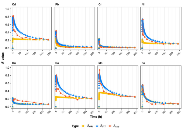 图3 Kinrooi农业土壤重金属R参数与DGT被动采样装置布置时间关系。(其中:Rexp表示实验测定R值;RFIT代表DIFS模型对Rexp的最优拟合结果;RORI为DIFS模型首次获得的R参数。