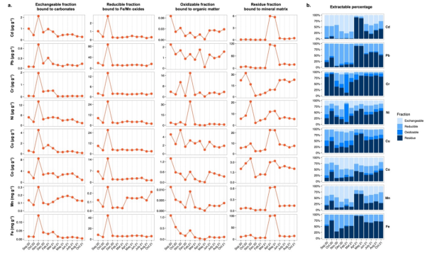 本研究系统调查了比利时Kinrooi地区农业土壤中多种金属元素的浓度、形态分布特征及其季节性变化,并评估了粪肥施用对金属污染行为的影响。研究结果显示,除铅(Pb)和钴(Co)外,大多数金属污染物在冬季浓度达到全年最高值,为其他季节的1.7至5.3倍,主要与冬季粪肥的集中施用有关。同时,土壤中金属的垂向深度分布也表现出明显的季节变化,受到耕作活动和植物生长周期的影响。连续提取分析表明,镉(Cd)、钴(Co)和锰(Mn)主要以可交换态形式存在,比例分别为42%、34%和41%,而镍(Ni)在该形态中也占20%,表明这些金属具有较高的活性和生物可利用性。相比之下,铅(Pb)主要以可还原态存在(52%),而铬(Cr)和铁(Fe)则主要富集于残渣态中,分别占66%和64%,表明其环境迁移性较低。