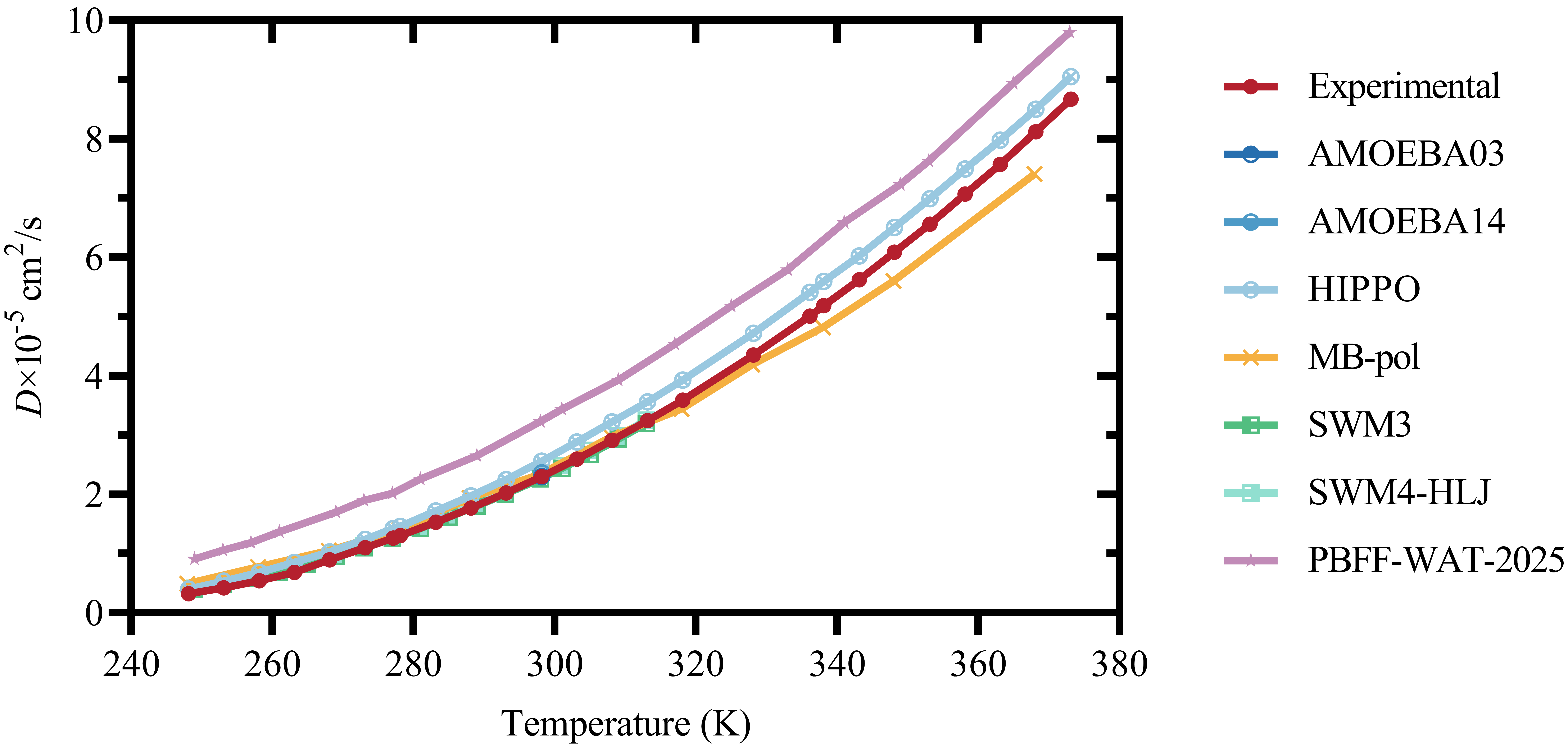 Figure 2[原文Figure 4(f)]的结果表明,PBFF-WAT-2025水模型的显著优势在于其能准确捕捉自扩散系数随温度变化的趋势,可靠的重现性(yexp=0.9407xPBFF-WAT-2025-0.6653,R²=0.999)可归因于PBFF-WAT-2025水模型纳入了描述氢键体系的轨道作用,准确描述了液态水体系的分子间作用力随温度变化的动态转换。PBFF-WAT-2025水模型基本捕捉了液态水的扩散行为,能够高效可靠地筛选不同环境条件下扩散系数的相对速度,或探索微观分子机制。