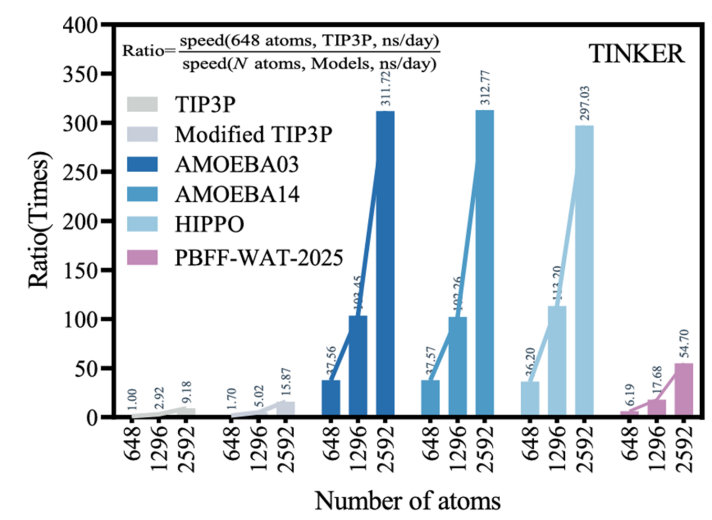 Figure 3 [原文Figure6(a)]对比了不同水模型随着模拟体系的增大,其计算开销的增长趋势。结果表明,随着模拟系统规模的增大,水模型的计算开销随之增大。Original TIP3P、Modified TIP3P及PBFF-WAT-2025水模型呈现低线性增长趋势,而AMOEBA03、AMOEBA14和HIPPO水模型则呈现出陡峭的增长趋势。随着模拟体系规模的增大,Original TIP3P、Modified TIP3P及PBFF-WAT-2025水模型在计算速度上更具优势。综合来看,PBFF-WAT-2025水模型的线性增长趋势和较低的计算效率,使其成为兼顾计算精度与计算效率的可极化水模型。在后续工作中,计划通过优化程序代码以及在AM1电荷计算中引入截断距离等方案进一步提升模型的计算效率。