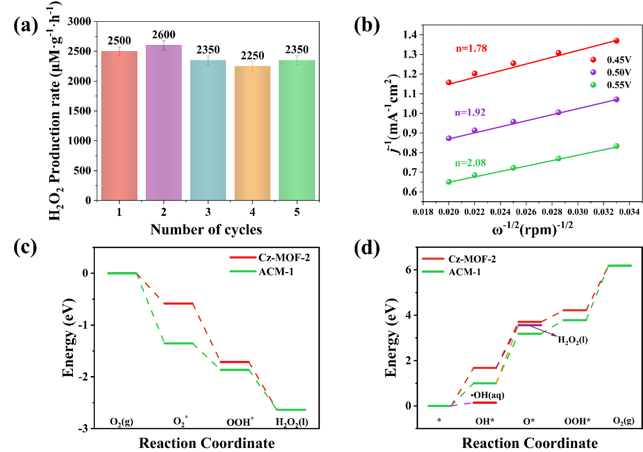 图3.(a)ACM-1催化H2O2生成的循环稳定性;(b)根据LSV计算得出的平均电子转移数;(c)双电子O₂还原路径的自由能图;(d)Cz-MOF-2和ACM-1材料在1电子、2电子和4电子水氧化过程中的自由能图。