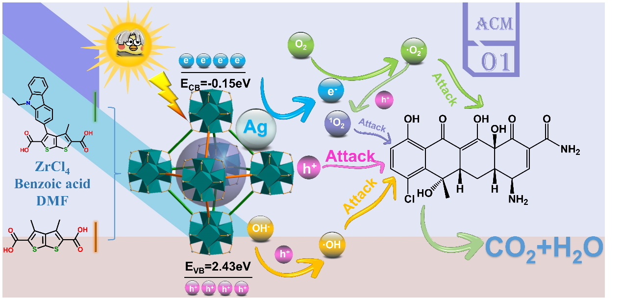 姜春杰教授、杨广生博士课题组将具有良好光捕获能力的咔唑基团共价修饰在水稳型类UiO-66化合物上,并将具有表面局域离子共振效应(LSPR)的银纳米粒子固定在MOFs的表面,构建了兼具良好光捕获能力以和优异的载流子分离能力的复合型光催化剂ACM-1。该催化剂展现出卓越的光催化性能:在氙灯模拟的太阳光照射1h后,四环素的降解率高达95%(表观反应速率常数Kapp=0.069 min⁻¹)。
