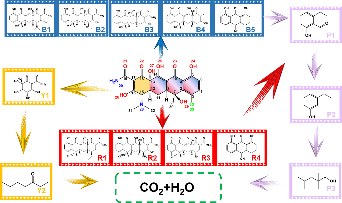 通过固体紫外光谱、光电流、阻抗等研究,本工作阐明了材料在可见光区域的吸收增强效应以及载流子分离效率提升的内在机制。自由基捕获实验和电子顺磁共振技术技术证明,该反应的活性中间体包括超氧自由基、羟基自由基和单线态氧。为了厘清四环素的降解历程,团队通过液质联用技术和DFT计算辅助揭示了四环素降解的4条关键路径,涉及脱氯、脱甲基、开环等12步反应。
